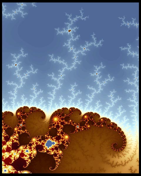 Fraktale sind mathematische Bilder. Die meisten Menschen denken bei "Mathematik" an stumpfes Gerechne und kryptische Begriffe, doch Fraktale zeigen sehr eindrucksvoll, daß etwas Wundervolles und Unfaßbares hinter den Begriffen steckt.